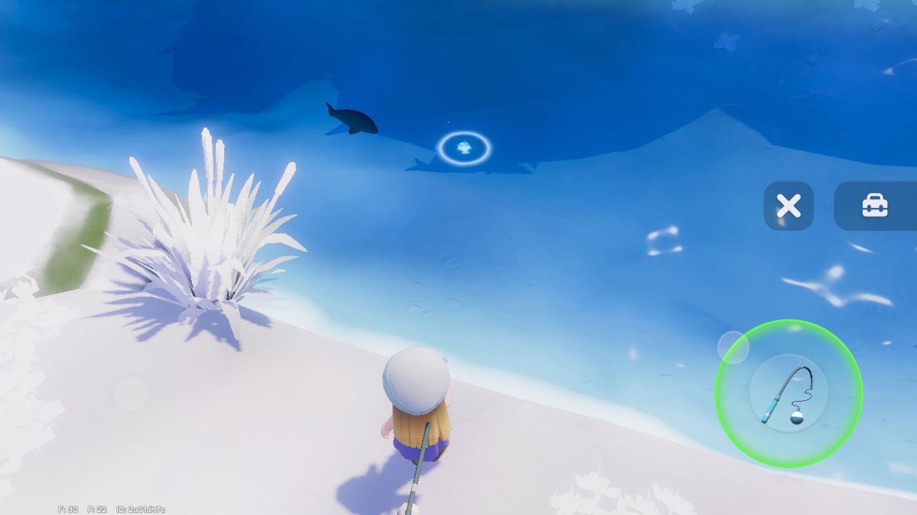 魚影には小型・中型・大型・金色があり、右下の釣りアイコンを長押しして釣りたい魚の影の近くに投げます。