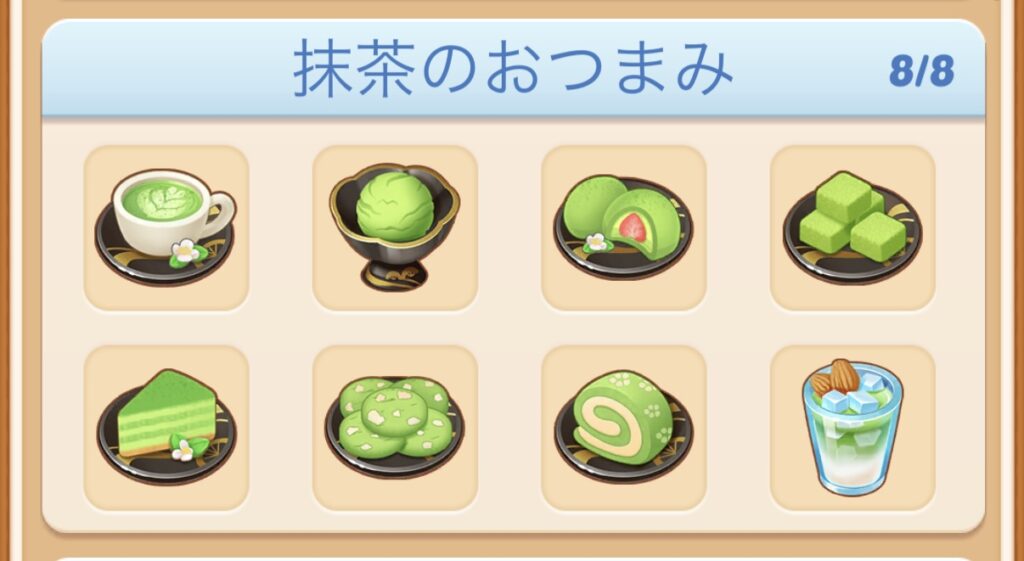 和食レシピが解放されると登場する「抹茶」の派生料理は、個人的にかなりツボなラインナップです。