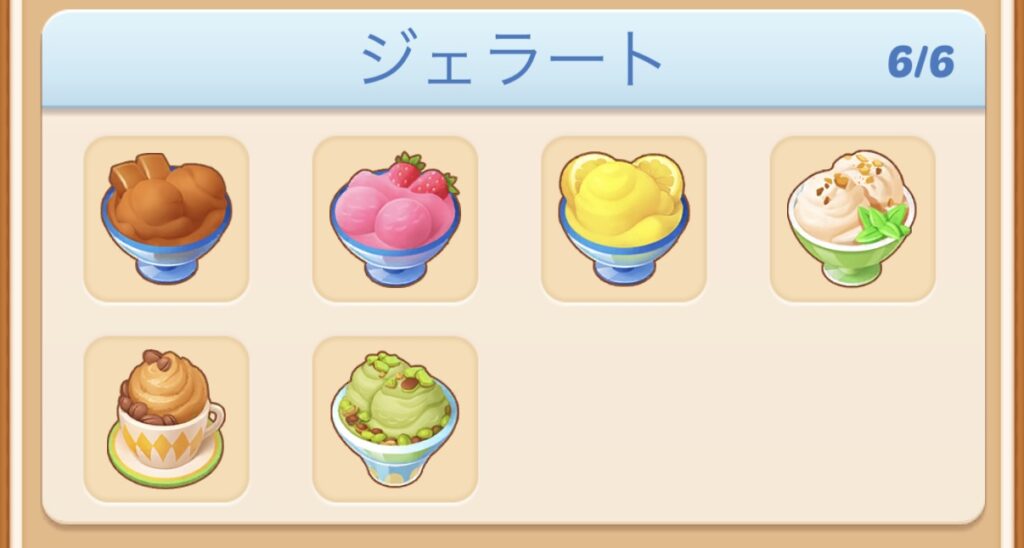 現段階で確認できるジェラートレシピは以下の6種類です。