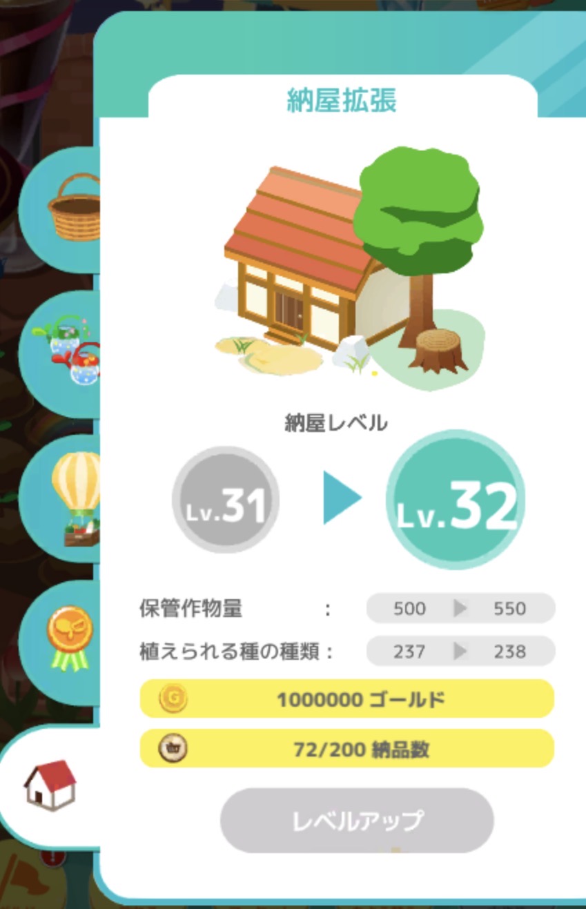 収穫した作物は納屋に保管されますが、保管できる数にはレベルごとの上限があります。