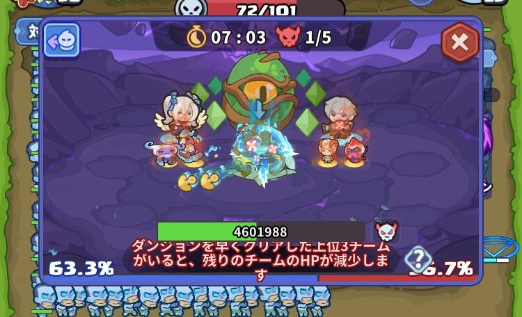 ※ダンジョンボスは撃破できなくても即敗北にはなりませんが、時間内に倒せないとチームHPが削られます。HPが0になると負けてしまうため、基本的には攻略を目指したほうが安定します。